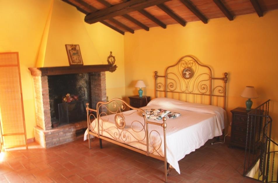 Vom Wohnraum aus führt eine Wendeltreppe direkt in das zweite Schlafzimmer im 1. Stock mit romantischem Doppelbett, offenem Kamin und einem Ausgang auf einen kleinen Balkon von dem aus eine Steintreppe in den Garten führt, der mit vielen Olivenbäumen bestanden ist. Etwas separat liegt, eingerahmt von Grün, der traumhaft schöne Pool mit Gartenmöbeln und Liegen, auch von hier hat man den schönsten Ausblick.