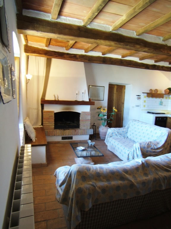 Über eine kleine Steintreppe kommt man zuerst in den Eingangsbereich mit einem Backofen - ein luftiges, schattiges Plätzchen, von wo aus man durch Rundbögen die beeindruckende Landschaft bewundern kann. Nun kommen wir zum Haus selbst. Der Wohnraum ist sehr gemütlich mit seinem offenen Kamin und davor einer gemütlichen Sitzgruppe. An der gegenüberliegenden Wand zieht sich über die ganze Breite eine Küchenzeile. Dazwischen liegt der schöne Essplatz. Dann kommen die Schlafzimmer, zwei mit Ehebetten eines mit zwei getrennt stehenden Betten und eines mit Einzelbett. Ein Bad mit Dusche ist natürlich auch vorhanden. Alle Räume sind mit Ziegelfußböden ausgestattet und haben wunderschöne Holzbalkendecken, also ein perfektes toskanisches Ambiente. Aus jedem Fenster hat man eine atemberaubende Aussicht über das Orcia-Tal bis hin nach Pienza und Castiglione d'Orcia. Vor dem Haus steht ein gemauerter Grill und daneben lädt ein großer Holztisch mit Bänken zum Essen im Freien ein. Auf der Wiese stehen Sonnenliegen zum Faulenzen. Hier ist ein idealer Ort, um sich von dem Stress des Alltags zu erholen.